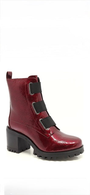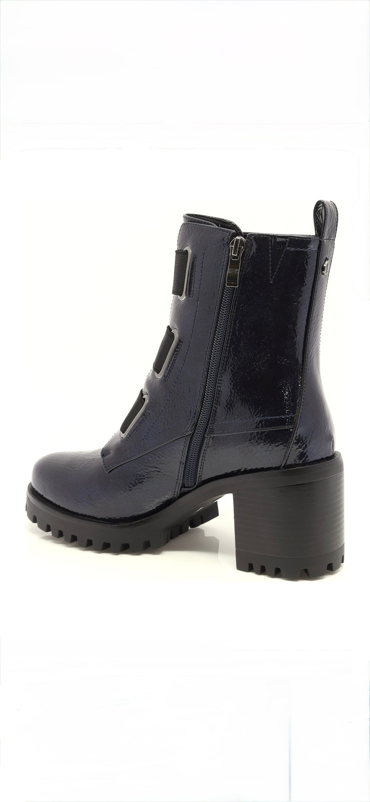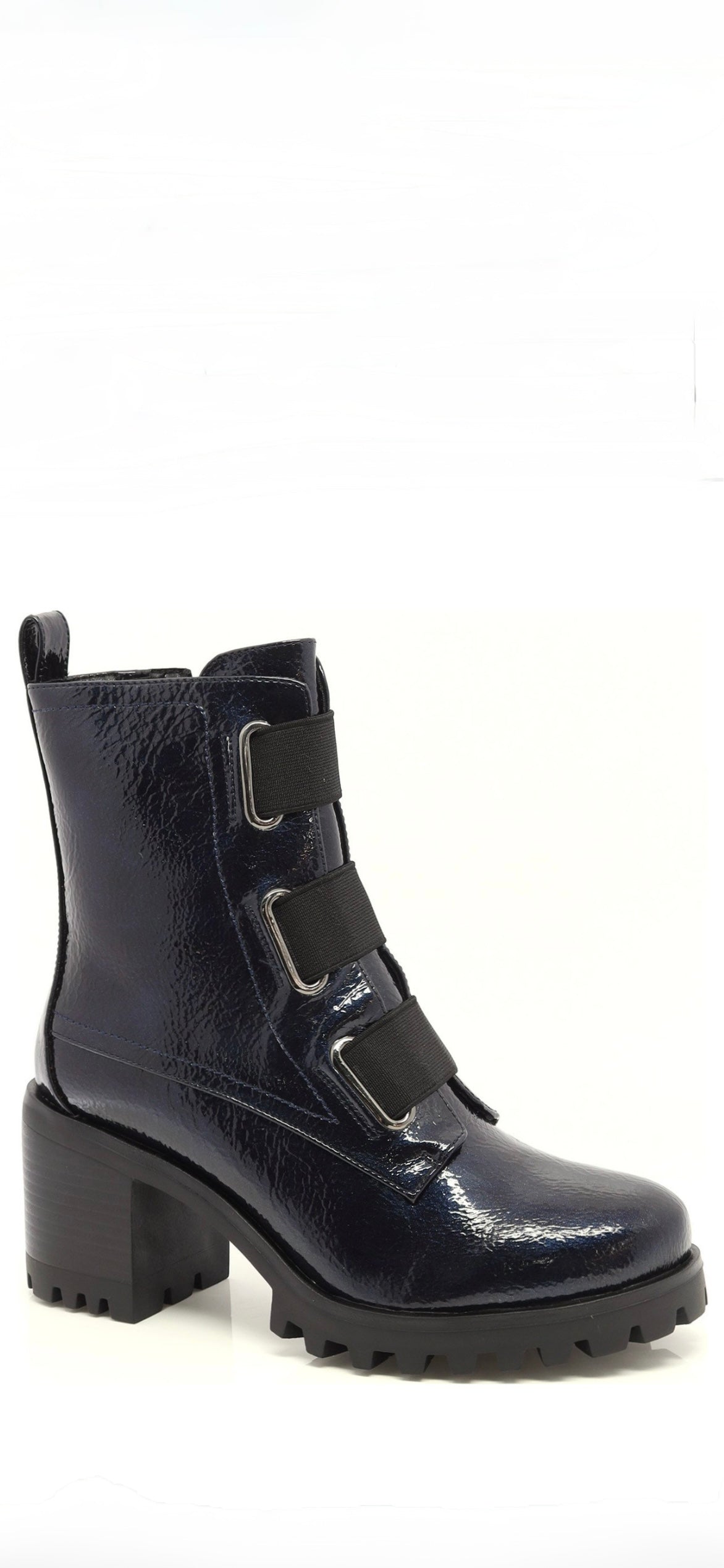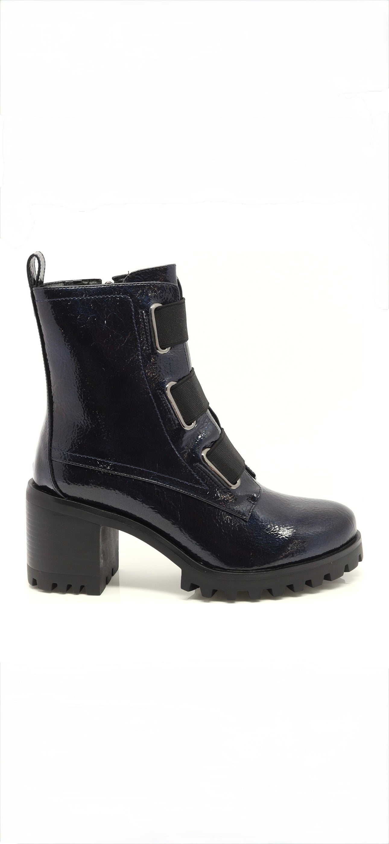 A stylish navy blue patent ankle boot with side zipper and elastic straps. Guaranteed against water infiltration for up to 6 months. Waterproof!!