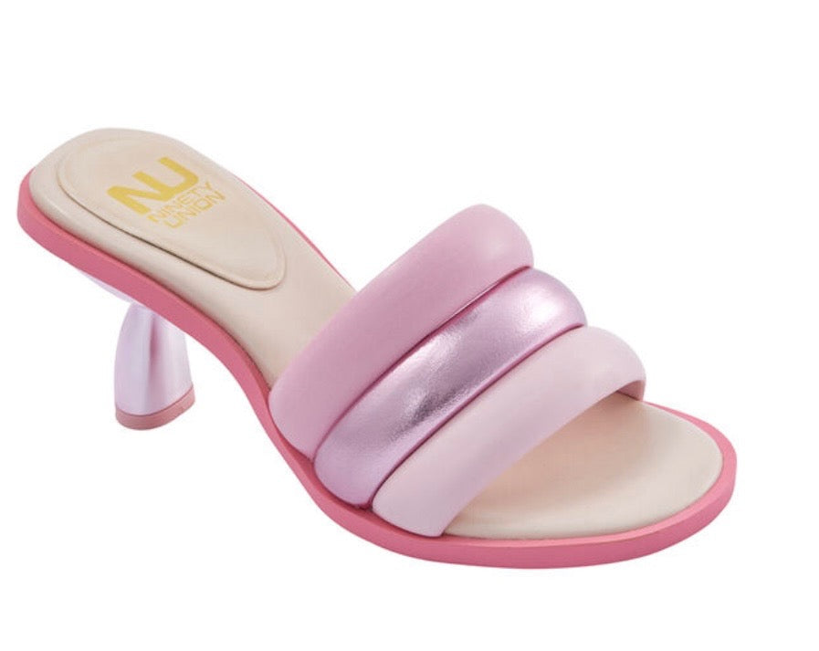 Comfortable Mid heel puffy strap sandal. Designed with bold colors to excite any outfit.