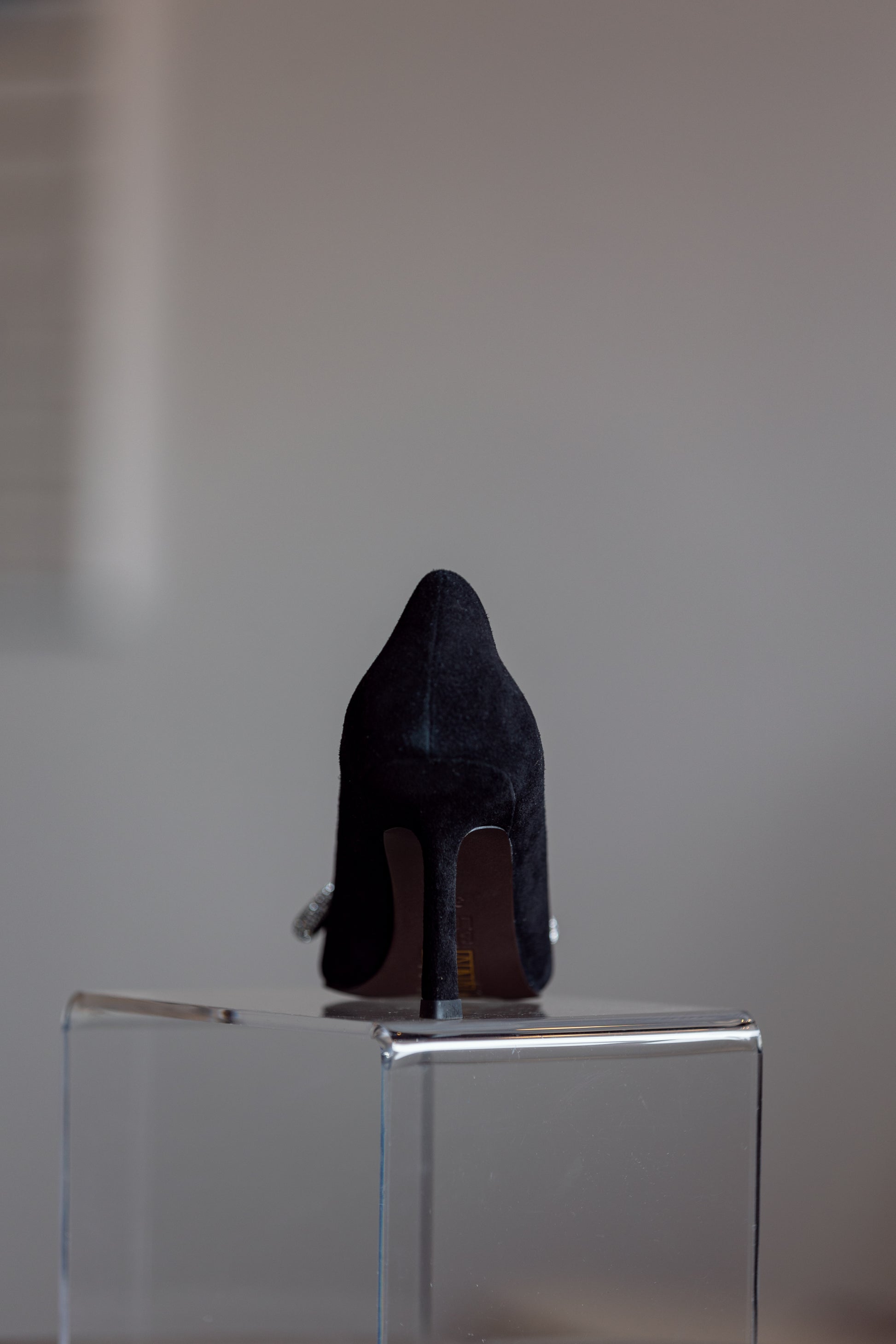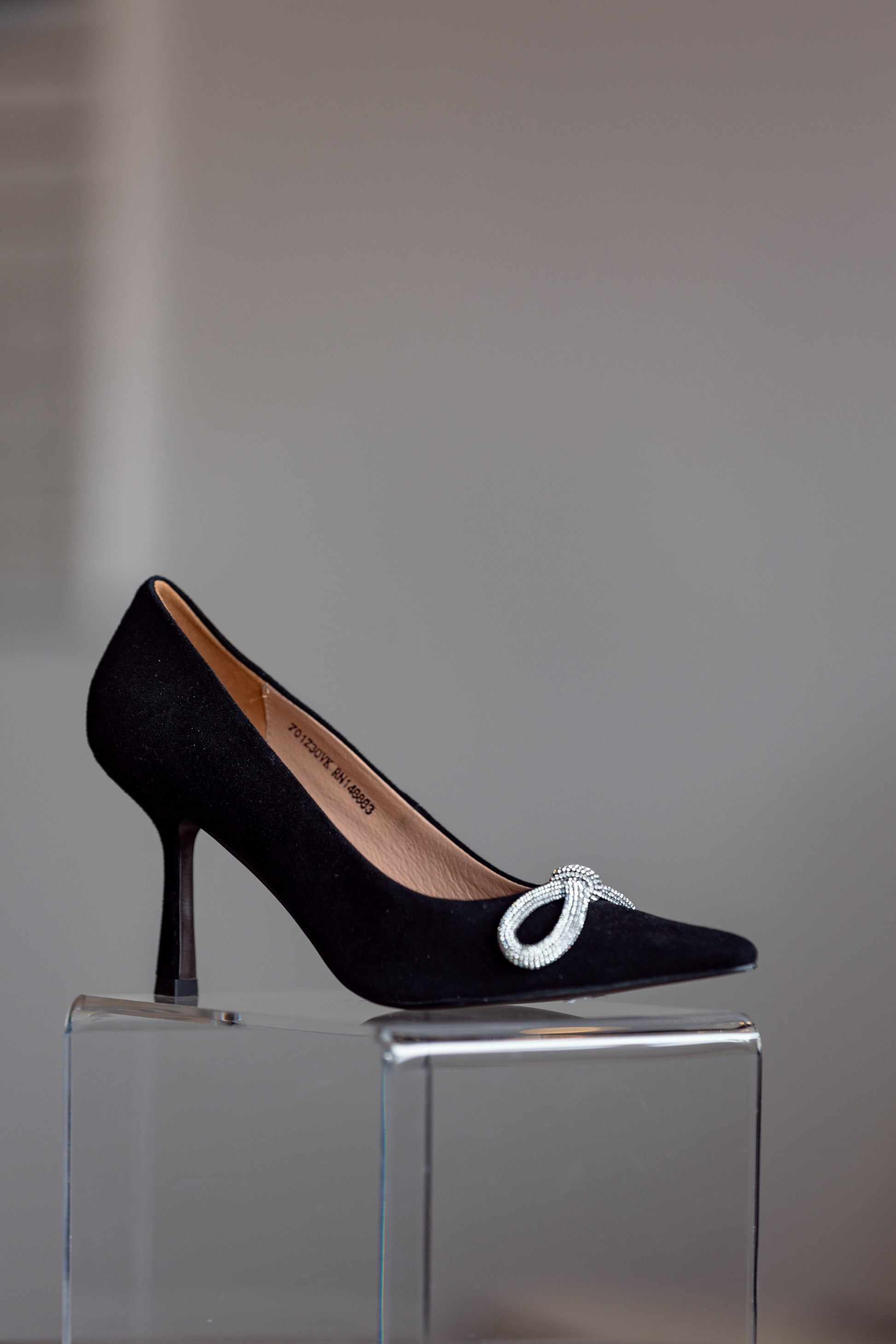 Black suede high heel pump with rhinestone bow. The perfect pump for all occasions!