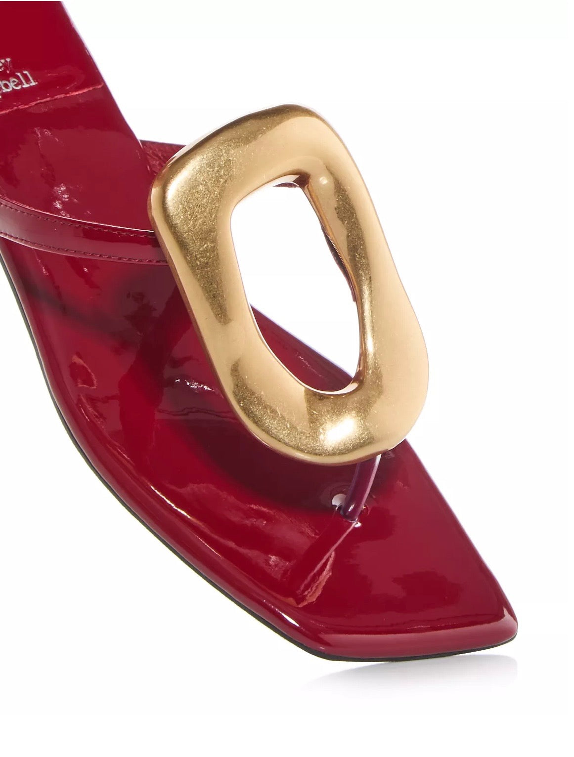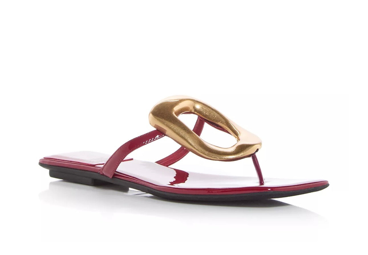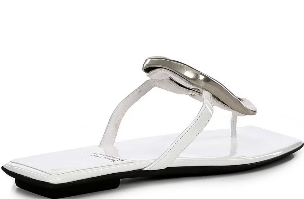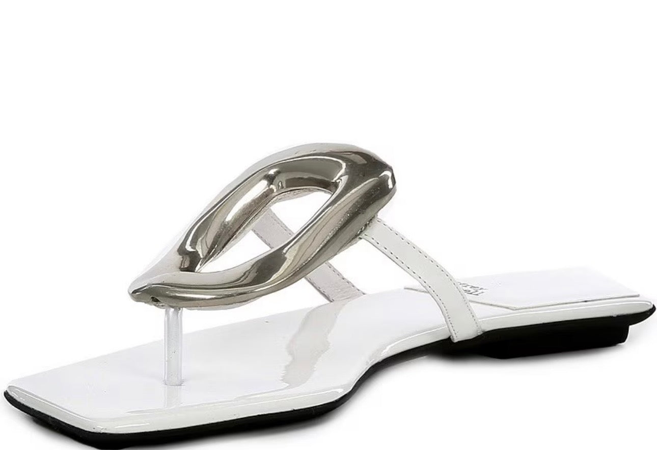 A polished link shaped buckle and diagonally slanted square toe top this sleek flip-flop crafted from smooth leather!