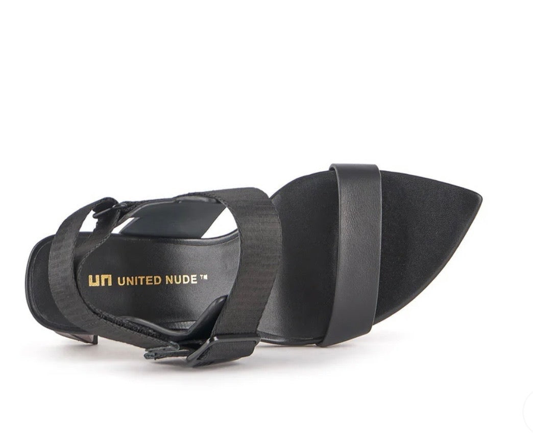Mid Heel Sandal with a modern raw cut, waxed leather upper complemented by sporty metal hardware, and a mirrored leather wrapped heel.