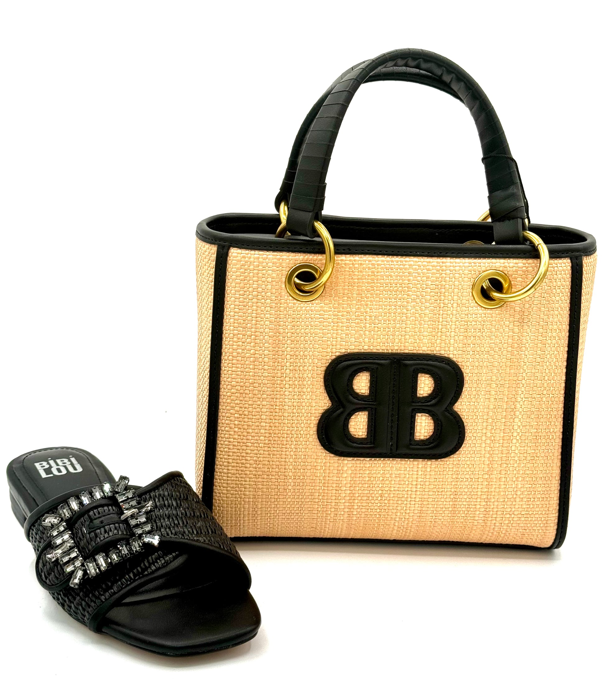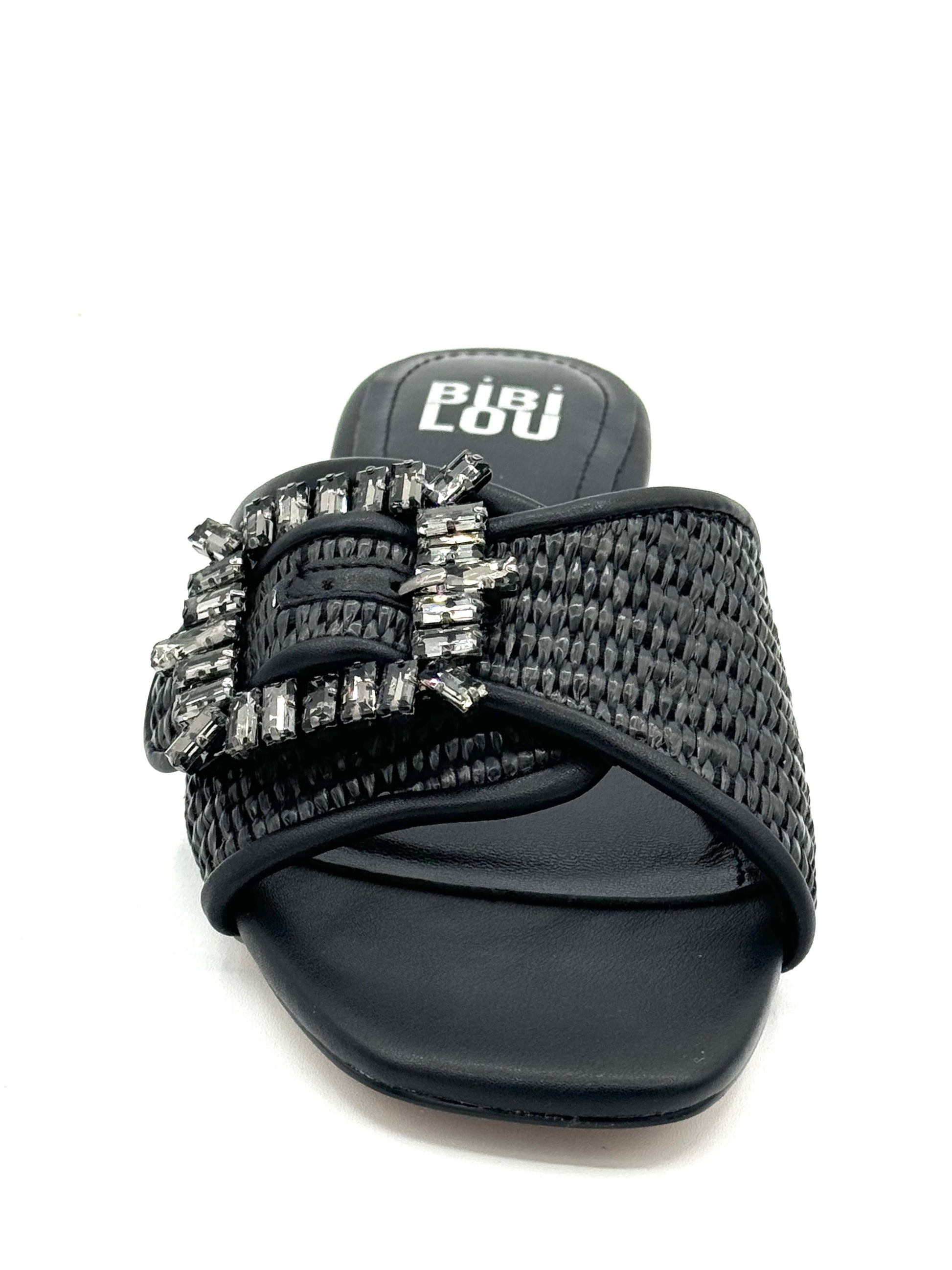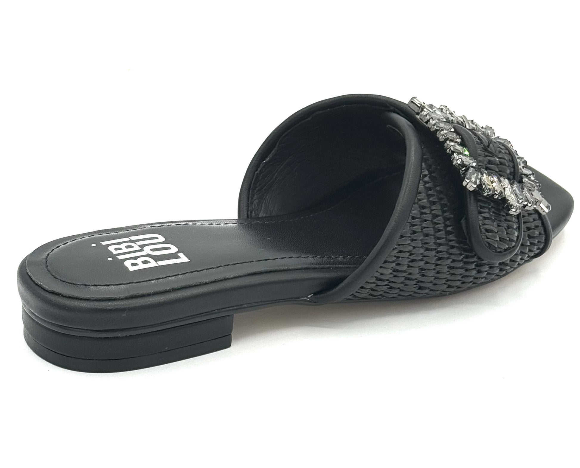 Beautiful flat raffia sandal with rhinestone buckle gives the mule a casual and at the same time an elegant appeal.