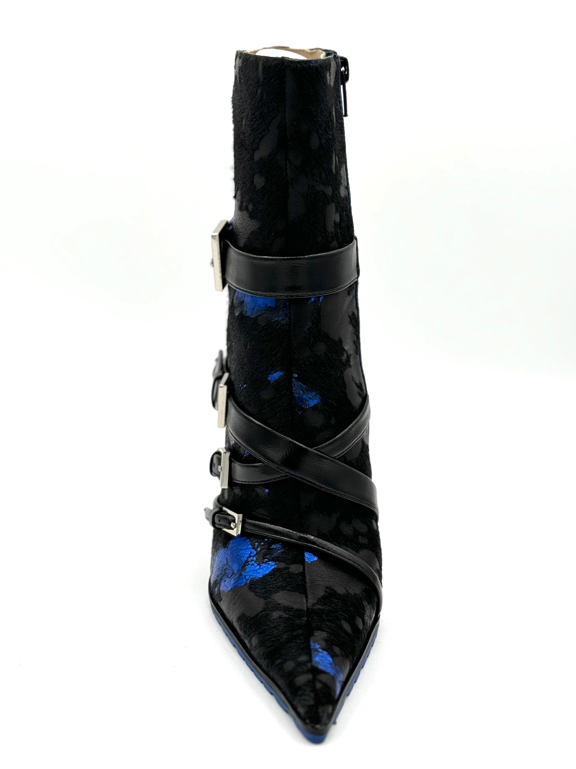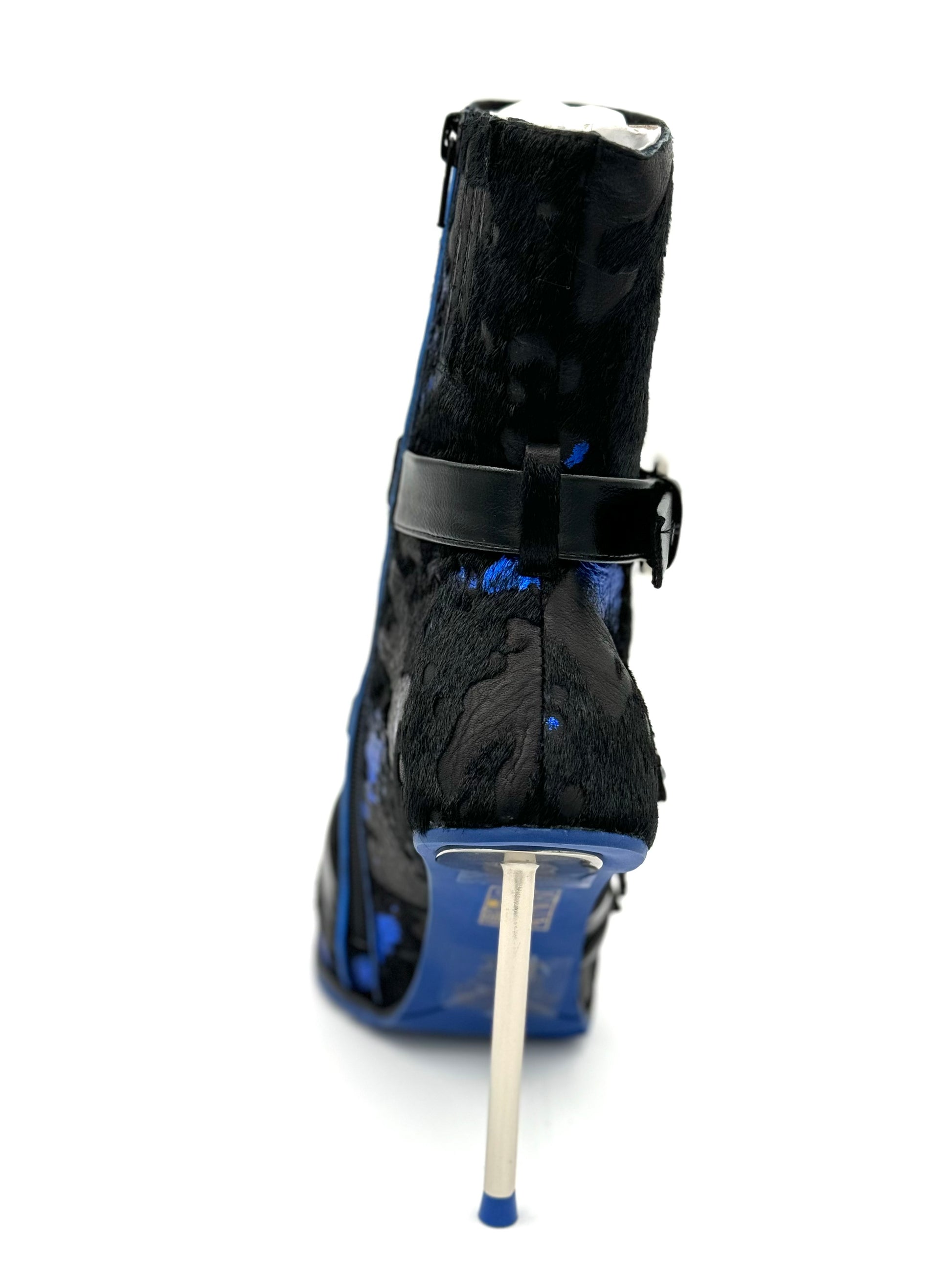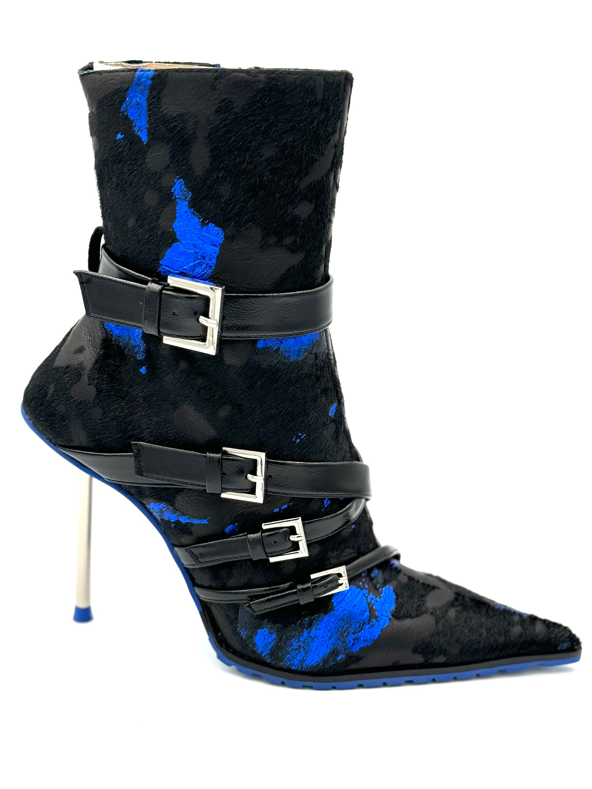 Black pony hair boot with blue metallic trim and 4 strap buckles and side zipper. Outstanding!!!