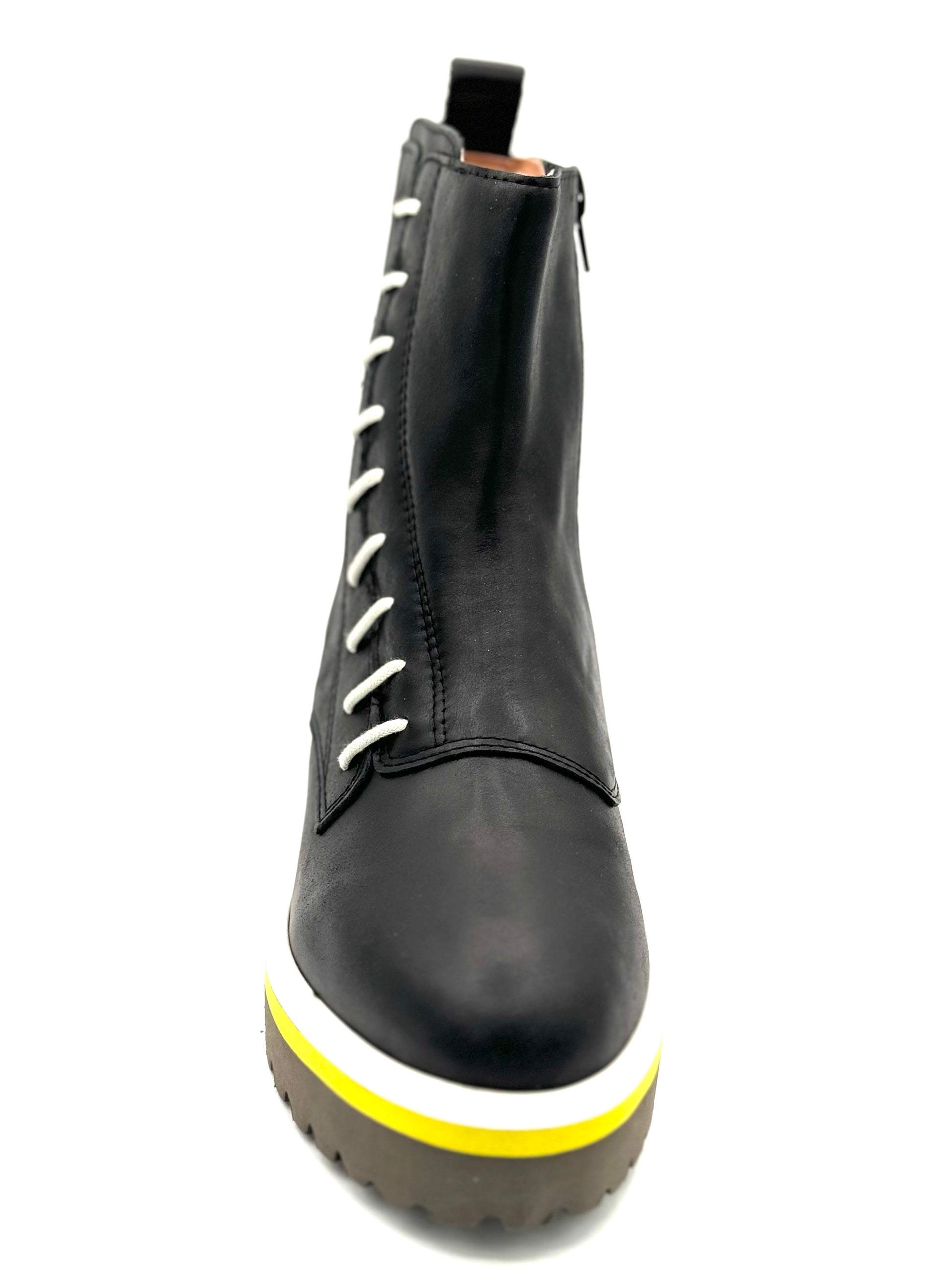 Black Leather boot with Yellow Stripe on sole and white laces on side