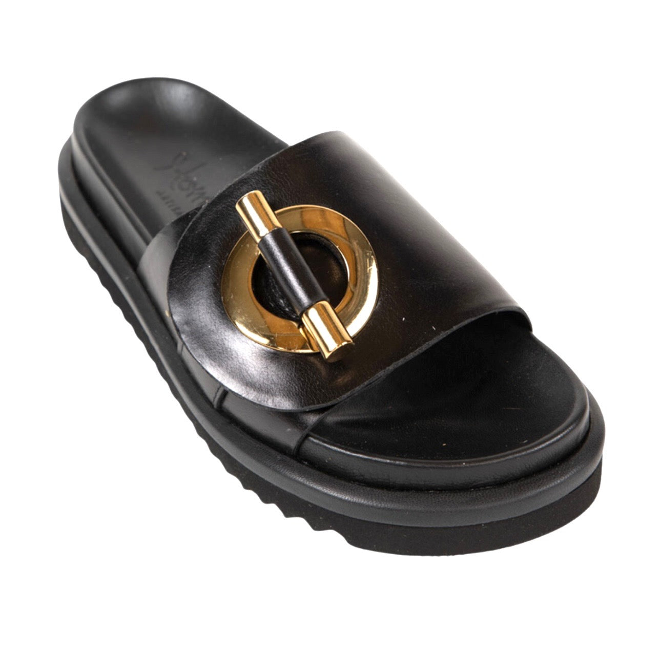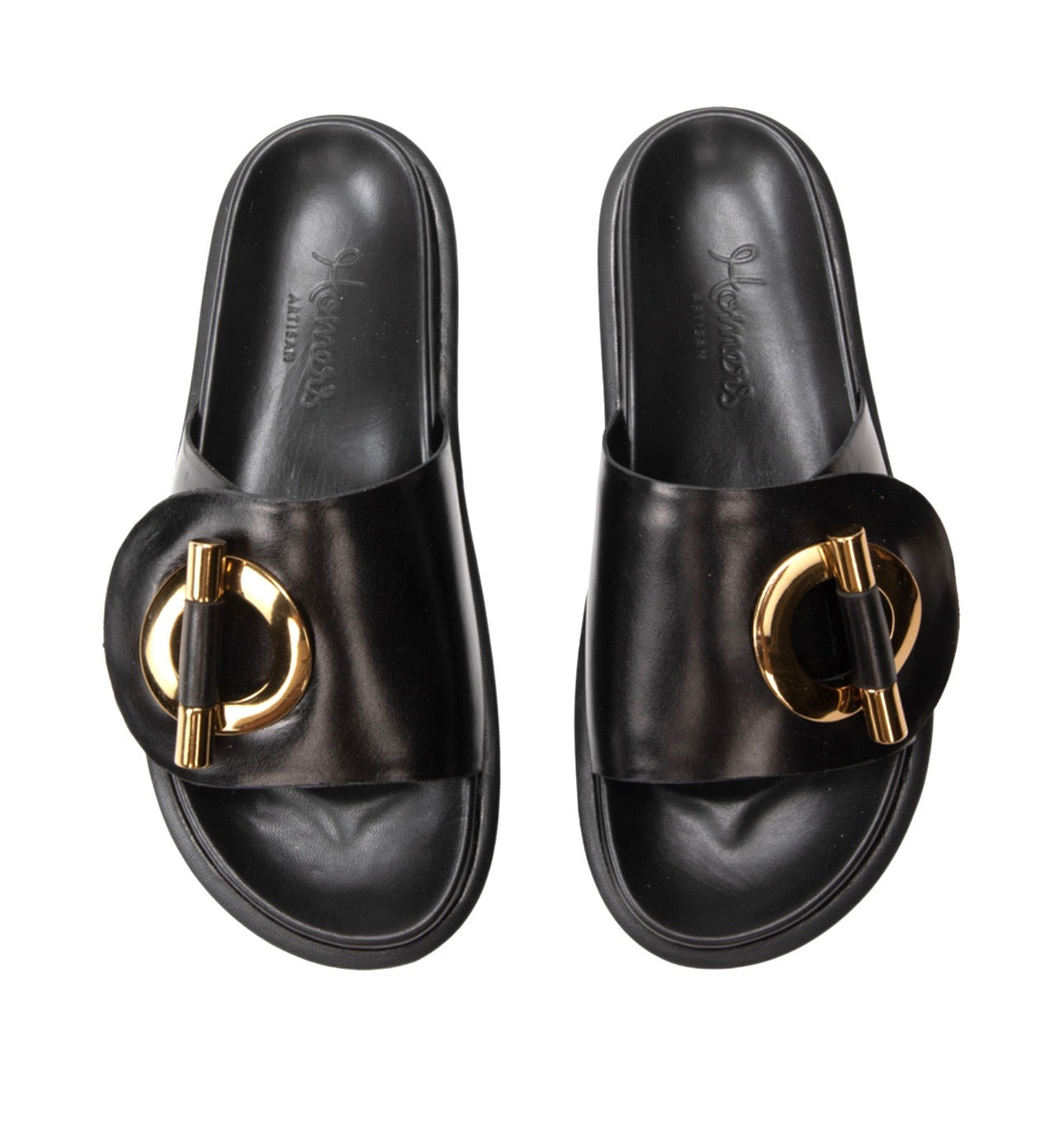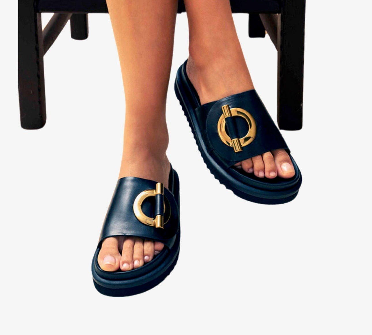 The perfect flat sandal for a chic and comfortable addition to any look! The gold hardware accent gives it a modernized and sleek appearance.