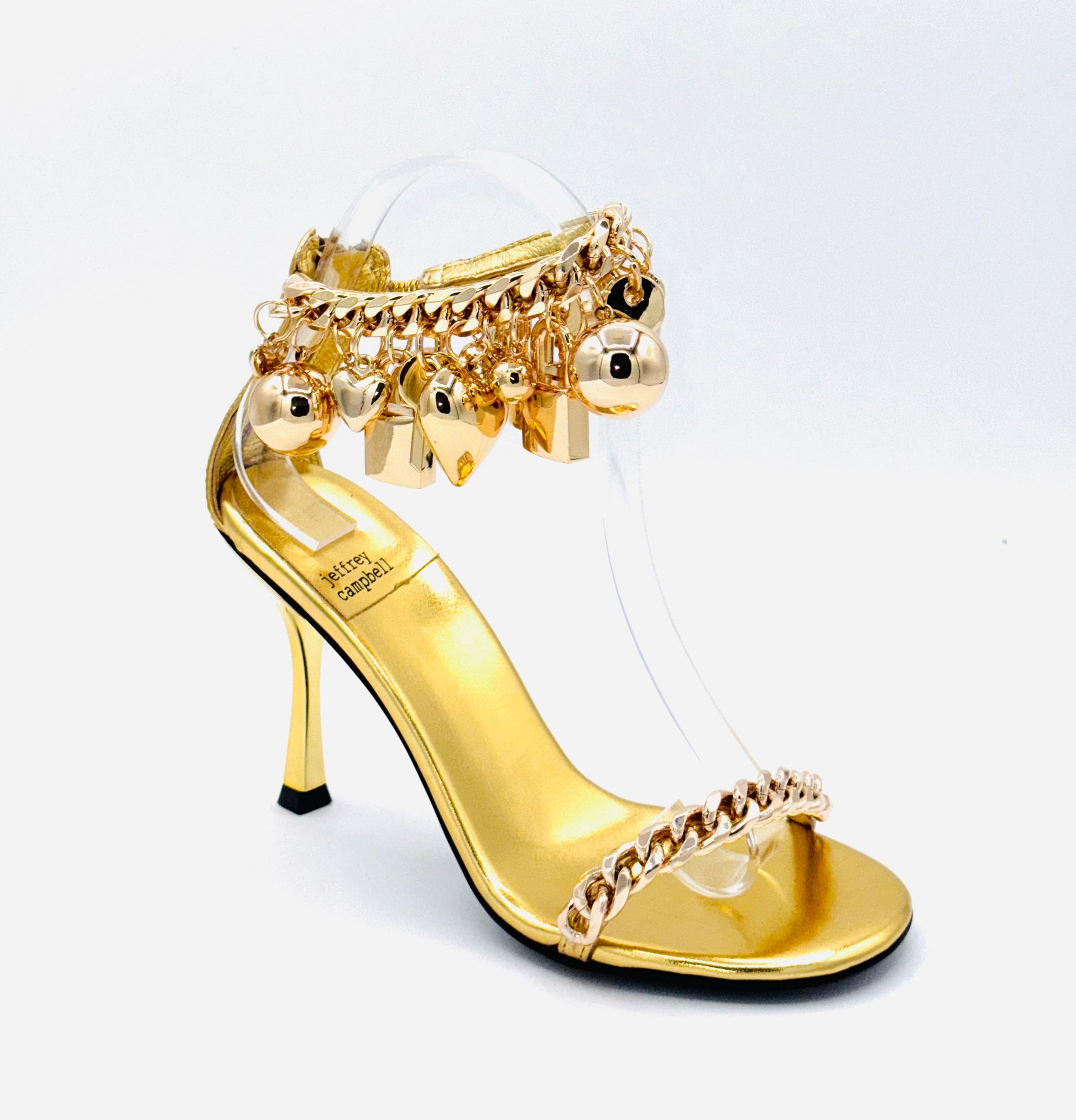 Gold Metallic gleaming chain-link hardware and a cascade of heart and lock shaped charms dial up the glamour of this ankle strap sandal lifted by a towering stiletto