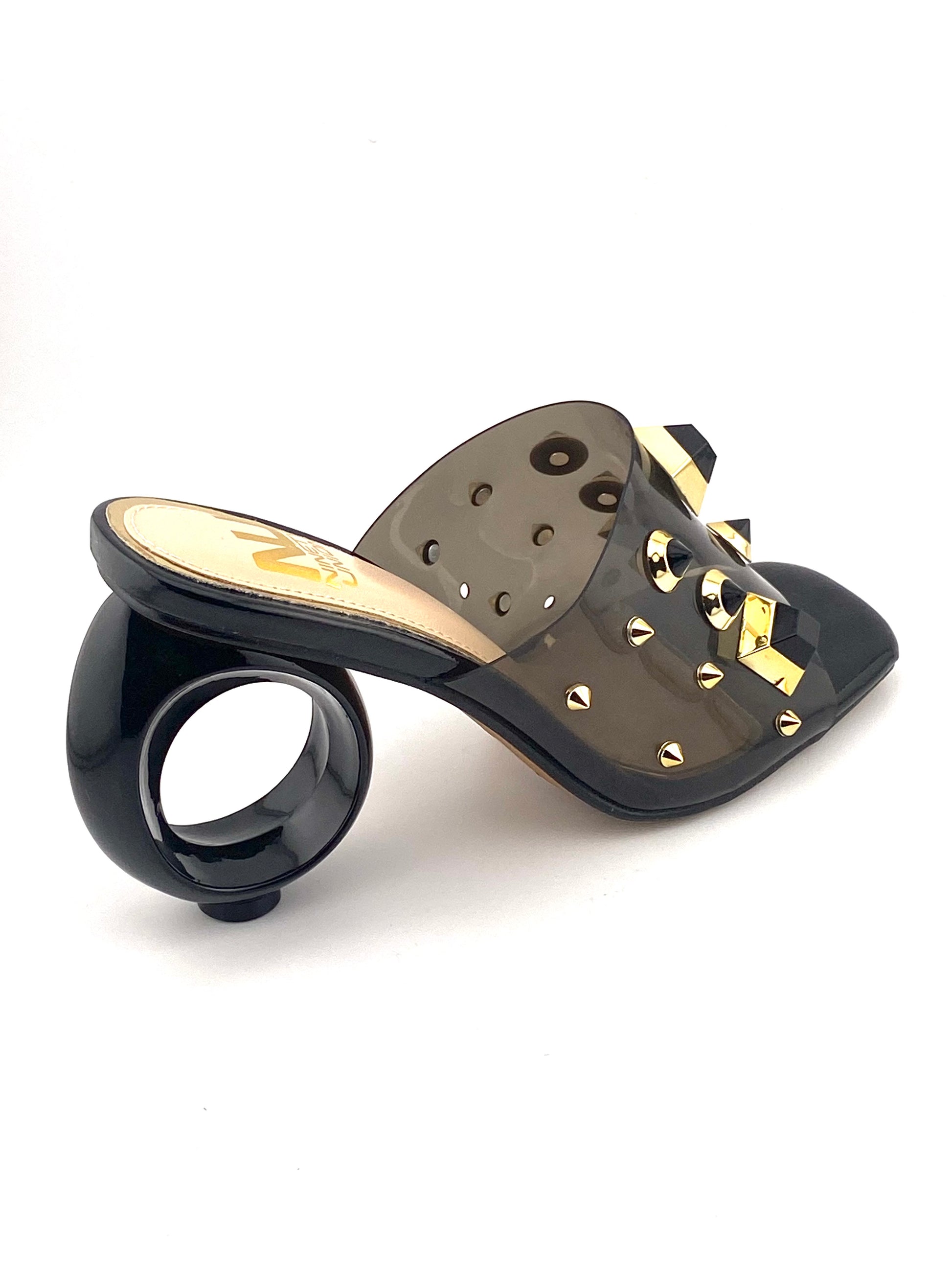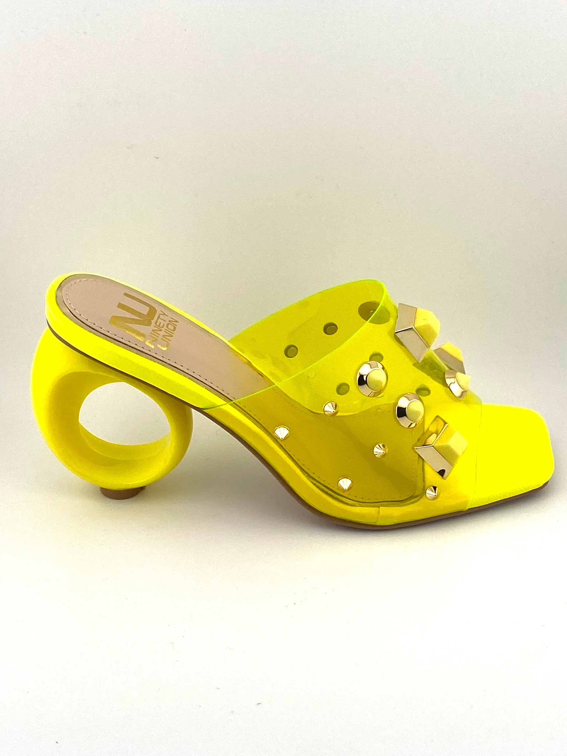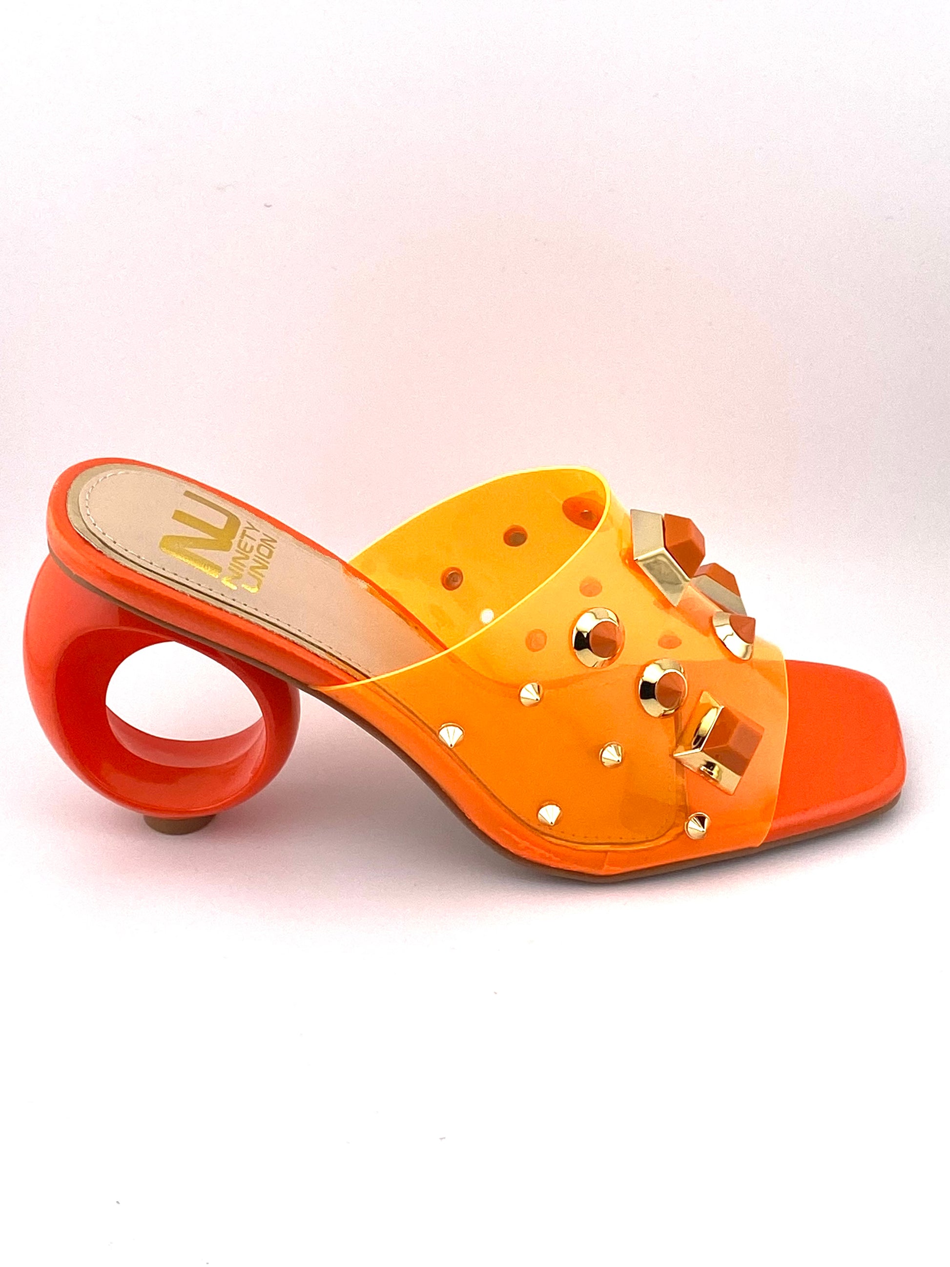 Let loose your flashy vibes strutting in the Vegas sandal. Fashionably elevated by circular heel, this slip on sandal has a transparent lucite upper that’s accented with contrasting stones for a playful look.