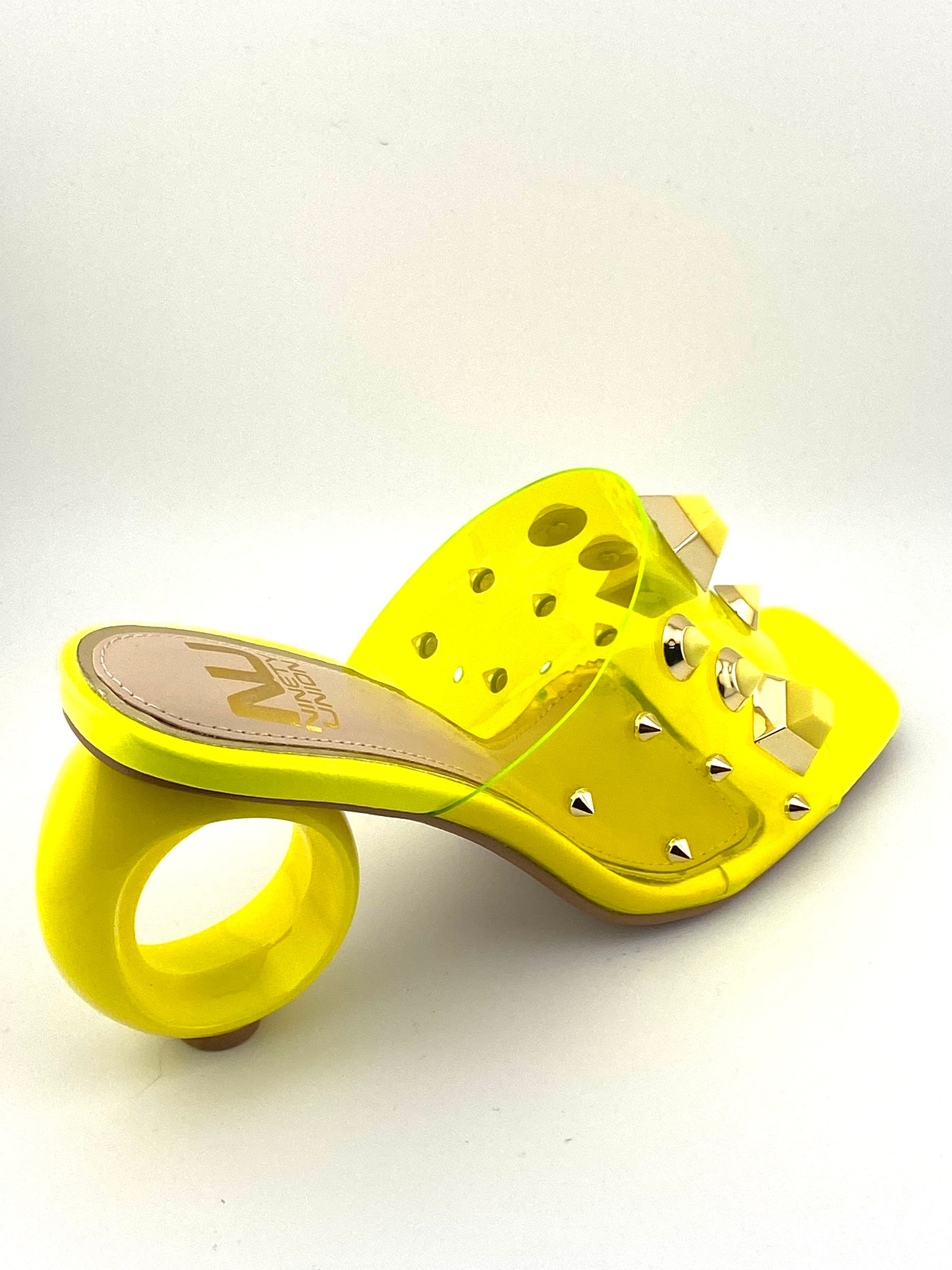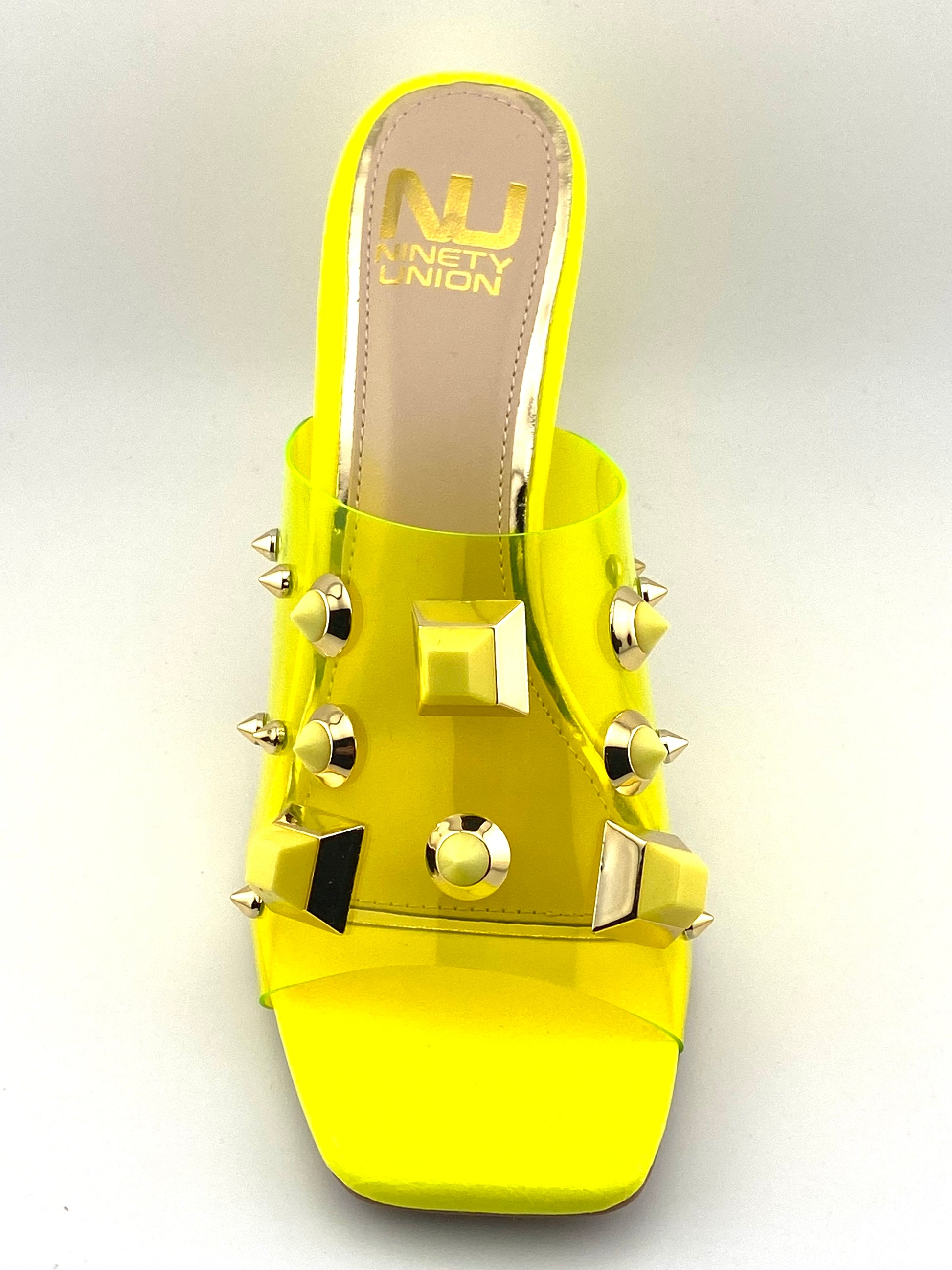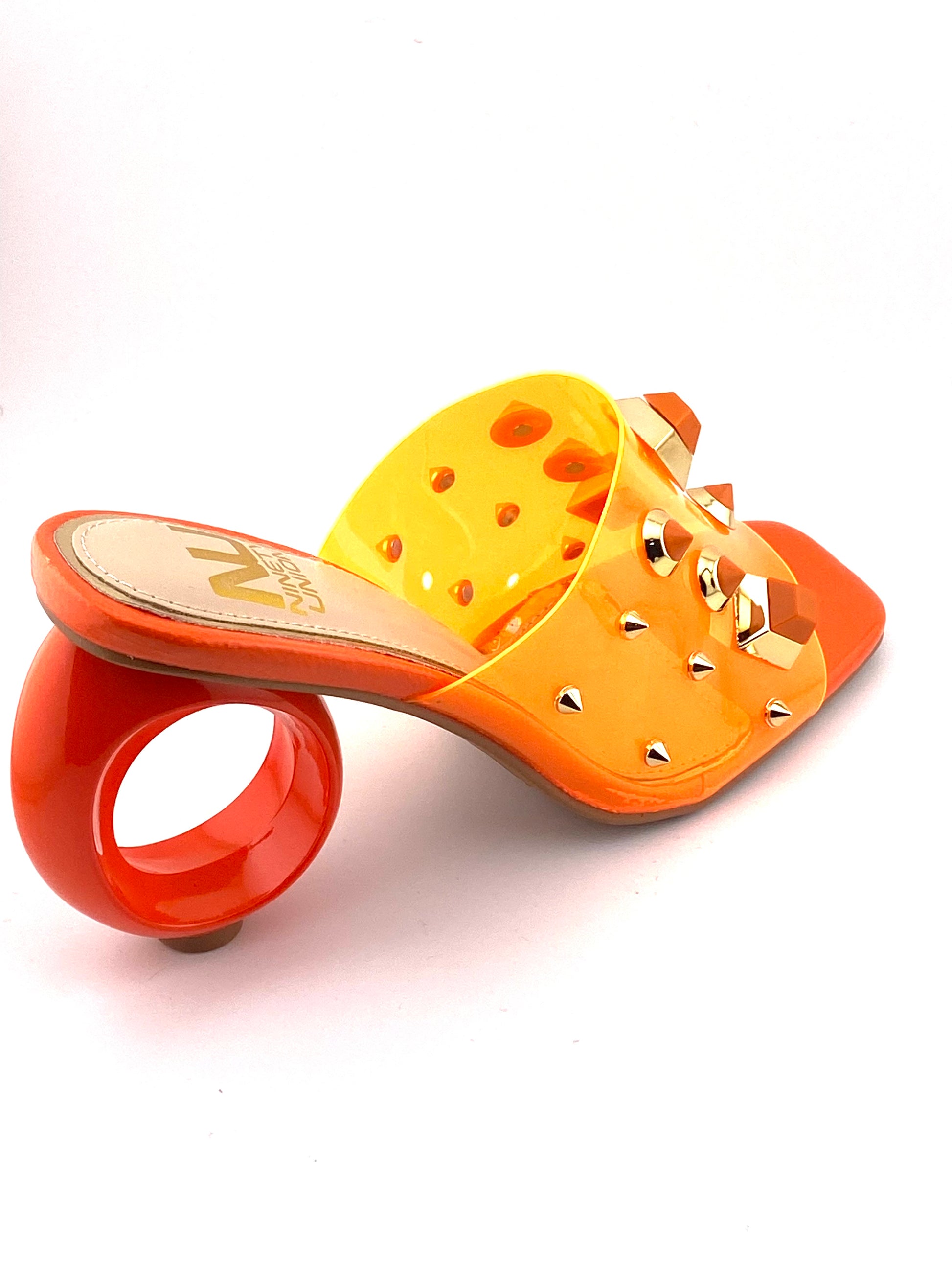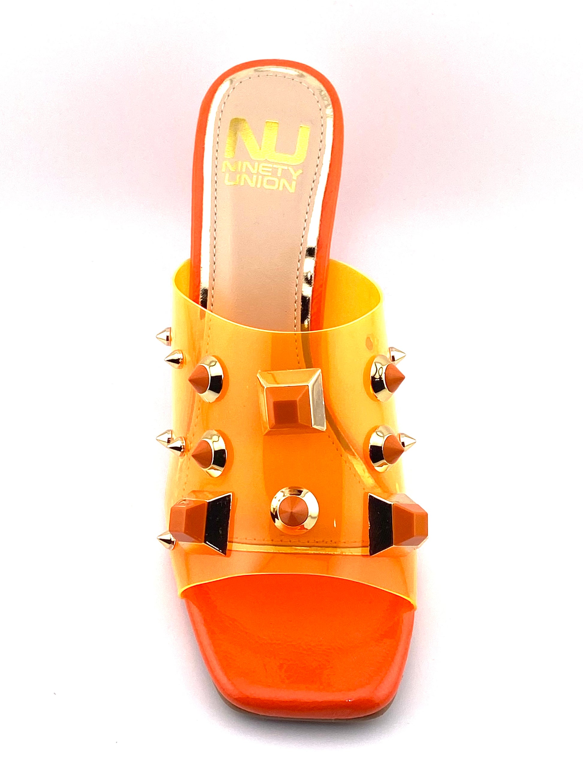 Let loose your flashy vibes strutting in the Vegas sandal. Fashionably elevated by circular heel, this slip on sandal has a transparent lucite upper that’s accented with contrasting stones for a playful look.